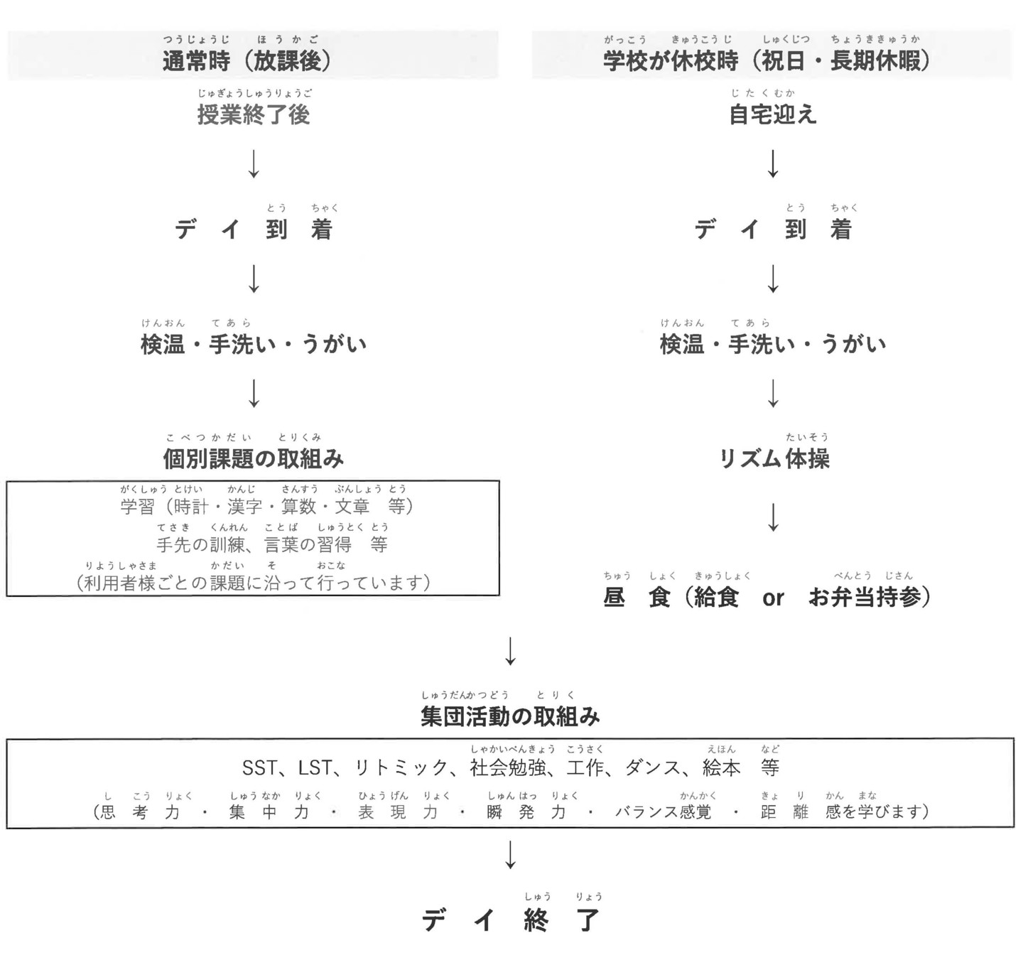 対象年齢 | 未就学(0歳~6歳まで)(児童発達支援) 就学 している小学生~高校生(放課後等デイサービス) ※市区町村で発行される通所受給者証が必要となります。 |